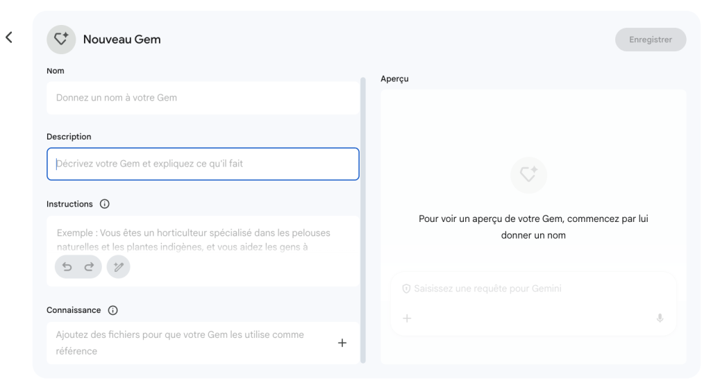 Les instructions sont l’élément le plus important de votre Gem personnalisé. C’est ici que vous indiquez à l’IA exactement ce que vous voulez qu’elle fasse.