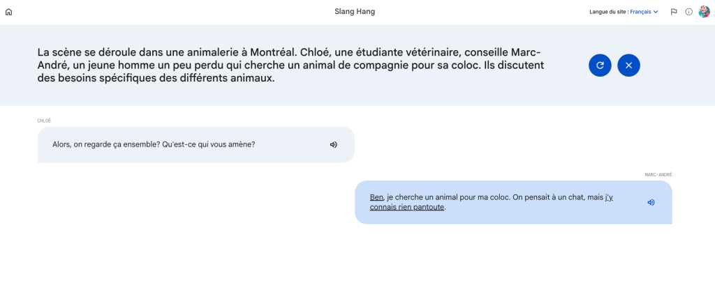 Le deuxième outil, Slang Hang, propose des scénarios de conversation entre deux locuteurs pour découvrir des expressions idiomatiques et régionales. On peut lire ou écouter les dialogues, et les expressions sont mises en contexte.