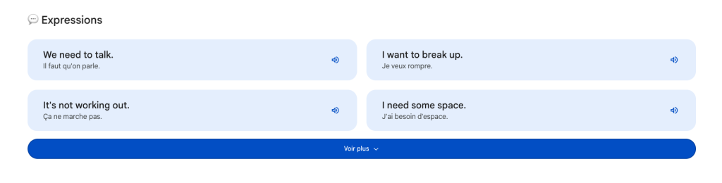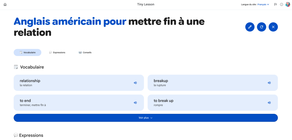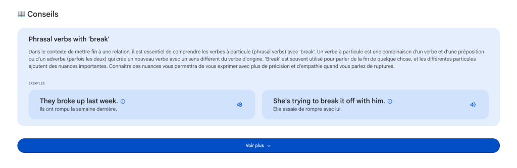 Ce premier outil permet de choisir une langue cible, ainsi qu’une mise en situation ou un thème selon nos intérêts, ce qui rend l’expérience très personnalisable. L’interface est en français, mais les scénarios et les leçons sont adaptés à la langue choisie. J’ai testé des contextes variés, allant de scénarios simples comme réserver un hôtel à d’autres un peu plus « crunchy » comme mettre fin à une relation.