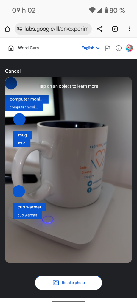 Ce dernier outil fonctionne mieux avec un appareil mobile, mais fonctionne avec la caméra de n’importe quel appareil. On prend une photo, et l’intelligence artificielle analyse l’image pour étiqueter les objets à l’écran et générer le vocabulaire associé. J’ai testé avec une photo de ma tasse à café (je sais, pas bien original…) et chaque élément de l’image a été nommé. Une belle façon d’apprendre en mode visuel !
